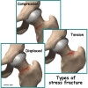 1. 긴장성 피로골절(tension-side stress fracture) : 노인에게서 흔하며 대퇴골 몸쪽 목을 가로질러 골절이 되며 전위 위험이 큽니다.