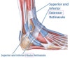 오른쪽 발목의 경우 장지신근(extensor digitorum longus)와 장모지신근(extensor hallucis longus)은 상하신근지대(superior & inferior extensor retinaculum) 아래를 지나서 주행하기 때문에 위 근육들이 염좌 등의 이유로 긴장할 경우 인접한 지대(retinaculum)를 자극하여 천비골신경(superior peroneal nerve)의 분지인 내측족배피신경(medial dorsal cutaneous branch)와 중간족배피신경(intermediate dorsal cutaneous branch)에 영향을 주어 통증을 일으킬 가능성은 충분해 보인다.