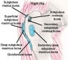 둔근건(gluteal tendon)의 염증도 유사한 증상을 나타나며 고관절 밖에서 뭔가 걸리는 듯한 느낌(snapping hip의 external type)이 들 수 있습니다.