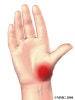 엄지 바닥의 앞, 가쪽에 압통이 임상적인 특징입니다.