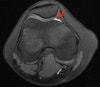 MRI의 axial view에서 transverse thick line이 보이면 medial parapatellar plica입니다.