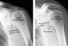 골관절염을 시사하는 다른 X-ray 이상소견은 상완골두가 편평해짐, 아래쪽 골극 형성, 관절오목의 뒤쪽 침식입니다.