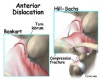 어깨 전방 탈구는 대부분 간접 외상에 의하며 젊은 연령의 급성 외상성 전방탈구에서는 대부분 Bankart lesion 또는 관절낭의 파열이 존재하며 관절와 전방연에 상완골이 압착되어 상완골두 후측방 부위에서 압박 골절이 동반될 수 있습니다(Hill-Sachs lesion).