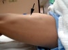 오른쪽 허벅지를 자세히 살피니 해당 부위에 멍(bruise)과 부종(swelling)이 관찰되었으며 통증 부위를 눌러보니 강한 압통을 호소하고 있었다.