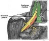 액와신경, 근피신경, 정중신경, 요골신경, 척골신경의 운동 및 감각기능을 진찰합니다.
