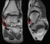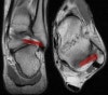 Coronal (left) and axial (right) T1W images assessing the normal posterior talofibular ligament. This ligament is normally less dark than the anterior talofibular ligament.