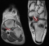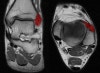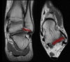 Coronal (left) and axial (right) T1W images assessing the deep portion of the deltoid ligament.