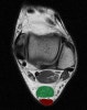 Axial T1W image assessing the normal Achilles tendon (red). Normally the Achilles tendon is concave or flat on axial imaging.