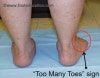 뒤에서 보면 전족의 외전과 뒷발의 외반으로 인해 2개 이상의 발가락이 보입니다(too many toes sign)