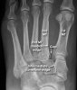 처음부터 간격이 넓은 증례에서는 나사를 사용하여 투시하에 경피적으로 내측 설상골과 제2중족골 기저부를 고정합니다.