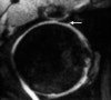 Axial oblique T2 gradient echo MR arthrogram demonstrating anterior and posterior portions of acetabular labrum.