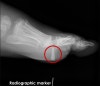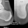 Lateral view : Use of a second image shows the foreign body is within plantar-side soft tissues.