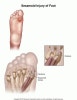 첫번째 발허리뼈머리 밑에 통증, 종창이 있으며 드물게 출혈반점이 보입니다.