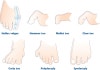 마찬가지로 가장 외측의 발톱이 변형되며 신발에 닿습니다. 고정된 발가락은 출생 시에 절제되는 일이 많으며, 삼각지 절골(delta phalanx)이 집게발 형태 다지증의 한 부분인 경우도 있습니다.