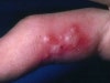 감염된 손가락에 갑자기 시작되는 홍반, 부종, 통증과 함께 수포성 또는 농포성의 군집된 병변이 나타납니다.