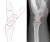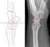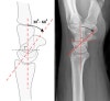 Since the midpoint of the proximal pole is often difficult to appreciate, an almost parallel line can be used that is traced along the most ventral points of the proximal and distal poles of the bone.