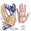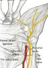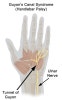 팔꿈치보다는 발생빈도가 낮고, 손목관절에 발생한 지방종, 결절종, 자동맥류(ulnar artery aneurysm), 또는 이상근육(muscle anomalyy)이 중요한 원인입니다.
