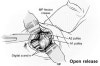 손가락의 굴근 힘줄은 활처럼 휘지 않게 해주는 4개의 윤상형 및 3개의 십자형 풀리(pulley) 밑을 앞뒤로 미끄러지며 움직입니다. 굴근 힘줄 또는 첫째 윤상형 풀리는 만성염증으로 두꺼워 질 수 있으며 이때는 운동제한이 생겨서 굴곡상태로 잠김현상이 옵니다.