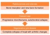 초기에는 뚜렷한 이상 소견이 없다가 시간이 지나면서 점차 괴사부 외연을 따라 골음영이 증가하고, 괴사부 내 골음영도 불규칙하게 변합니다.