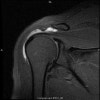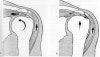 상완골두와 견봉하 사이의 간격이 좁아진 것은(정상은 > 7mm) 오래된 회전근개 파열을 시사합니다.