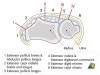제2중수골 기부의 배측에서 정지하는 장요측수근신근과 제3중수골 기부의 배측에서 정지하는 단요측수근신근이 주행하고 있다.