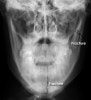 | • Disruption of the middle McGrigor-Campbell line is due to a comminuted fracture of the right zygomatic arch • Following the upper and lower lines shows no fracture | |