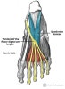 | 배부골간근(4개) (Dorsal interossei) | 인접한 중족골의 골간 | 1 : 제2족지 기절골 기저부 내측면 2~4 : 해당족지 기절골 기저부 외측면 | 제2,3,4족지의 외전 MP joint 굴곡 | 심비골신경 | |