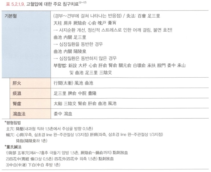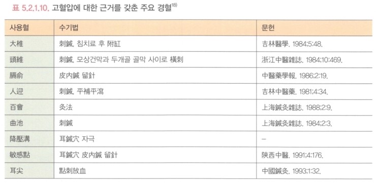 2009년 American Journal of Hypertension에 발표된 체계적 문헌고찰에 따르면, 항고혈압제제를 복용 중인 환자를 대상으로 침치료를 하였을 때, 수축기혈압과 확장기혈압이 모두 유의하게 하강한 것으로 확인되었다. 가장 많이 사용된 경혈은 태충, 곡지, 풍지, 족삼리, 풍륭 등이었다.
