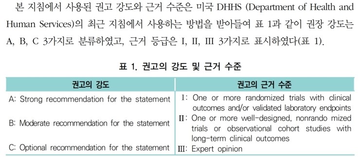 | 1. 권고의 강도 1) A : 권장할 만한 충분한 근거가 있다. 2) B : 충분한 근거가 있는 것은 아니지만 고려할 정도의 근거는 있다. 3) C : 권장하기에 근거가 불충분하다. 2. 근거 수준 1) I : 하나 이상의 무작위 대조연구의 근거가 있다. 2) II : 무작위 연구는 아니지만 잘 고안된 임상연구를 통한 근거가 있다. 3) III : 임상 경험이나 위원회 보고서를 기초로 한 권위자들의 견해 |