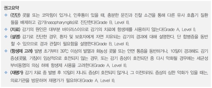 위에서 보다시피 감기의 원인은 대부분 바이러스이므로 감기의 치료에 항생제를 사용하지 않아야 합니다. 이 지침은 권고의 강도와 근거수준은 Grade A, Level I로 가장 높은 수준의 권고 강도와 근거수준을 가지고 있습니다.
