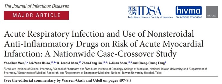 2015년에 'Journal of Infectious Diseases'에 발표된 'Acute Respiratory Infection and Use of Nonsteroidal Anti-Inflammatory Drugs on Risk of Acute Myocardial Infarction: A Nationwide Case-Crossover Study'이라는 논문은 2005년부터 2011년까지 약 7년간 대만 국민 건강 보험(National Health Insurance Program)의 통계를 분석한 것으로 약 10,000명의 심장 마비로 입원한 환자들의 데이터를 검토한 연구입니다.