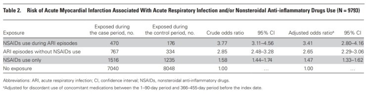 연구결과에 따르면, 급성 호흡기 감염 중에 비스테로이드 소염진통제(NSAIDs)를 복용한 사람들이 그렇지 않은 환자에 비해 심장 마비 위험이 3.4배 증가했습니다. 병원에서 진통제를 정맥 주사로 투여한 경우 심장 마비 위험은 위험 인자가 없는 환자의 7.2배로 훨씬 더 컸습니다.