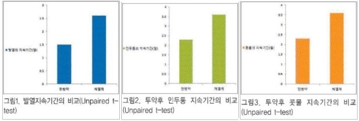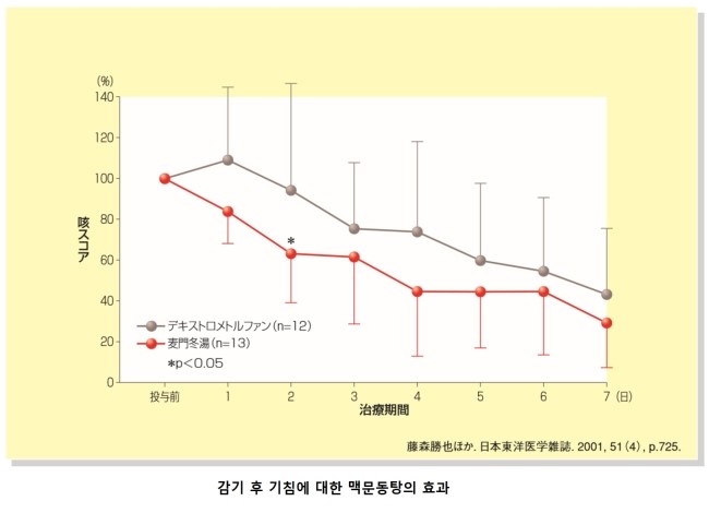 감기 후 3주 이상 기침이 남아있는 성인 환자 27명. 감기 이외의 원인에 의한 것으로 생각되는 지연성 기침 환자을 두 군으로 나눠 한 군에는 맥문동탕과 기관지 확장제를, 다른 한 군에는 기관지 확장제만을 투여하였습니다. 그 결과 맥문동탕과 기관지 확장제를 병용 투여한 군에서 유의하게 진해 효과를 나타냈습니다.