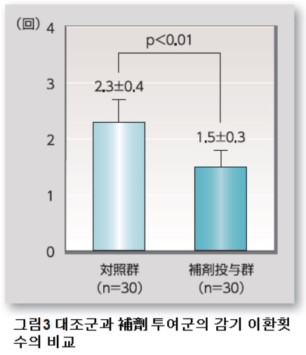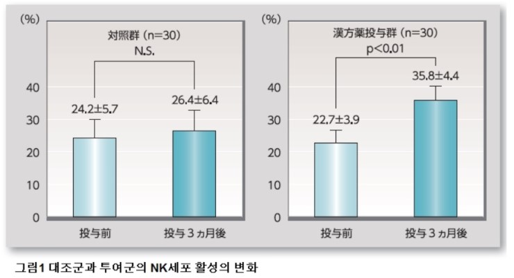 노인 60명을 대조군 30명과 한약(육군자탕, 보중익기탕, 십전대보탕, 인삼양영탕, 육미지황환, 팔미지황환, 우차신기환) 투여군 30명으로 나누어, 감기 이환횟수, 섭취 칼로리, 체중, NK세포 활성에 대해 검토를 했습니다. 한약 투여군은 투여 전에 비해 NK세포 활성이 유의하게 증가하게 증가하였고, 대조군보다 감기 이환횟수가 유의하게 저하되었습니다.