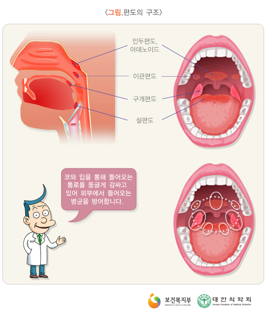아데노이드(인두편도, pharyngeal tonsil)는 목젖 위에 있는 편도 조직으로 입을 벌리면 육안으로 확인할 수 있는 구개편도(palatine tonsil)와는 다른 조직입니다.