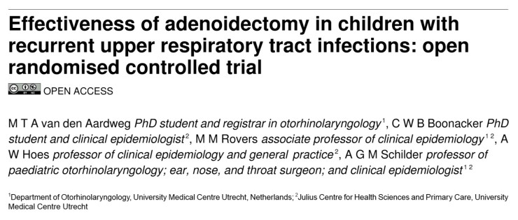 이러한 고민 해결에 도움이 될 만한 논문이 있어 소개해보겠습니다. 오늘 소개할 논문은 2011년에 영국의학학회지(British Medical Journal, BMJ)에 실린 '재발성 상기도감염 소아의 아데노이드 절제술의 효과에 관한 연구(Effectiveness of adenoidectomy in children with recurrent upper respiratory tract infections: open randomised controlled trial)'이라는 논문입니다.