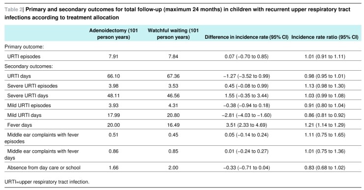 놀랍게도 추적기간 동안 상기도 감염 횟수는 수술군이 7.91회, 대조군이 7.84회로 통계적인 차이가 없었습니다. 그 외에도 총 감염일자, 발열일자, 학교결석일, 중이(中耳)의 증상, 삶의 질 역시 큰 차이가 없었습니다.