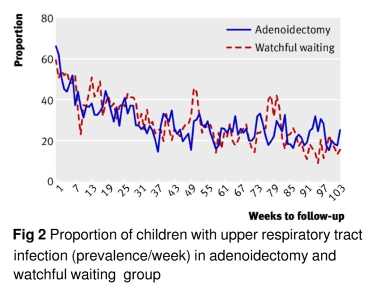 수술군과 대조군 모두 상기도 감염의 유병률이 시간이 지날수록 감소하는데, 그것은 질환의 자연경과 때문입니다. 다시 말하면 수술을 하든지 하지 않든지 아이들이 자랄수록 자연스럽게 상기도 감염에 덜 걸리게 된다는 뜻입니다.