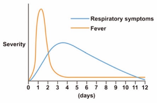 그래프에서 볼 수 있듯이 대부분의 감기는 초기 23일 정도 열이 나다가 열은 떨어지게 됩니다. 그 이후에는 기침, 콧물 등의 증상이 발생하여 35일 경에 가장 심해집니다. 그 후 증상은 점차 호전되어 7일이 지나면 대부분의 환자는 회복되게 됩니다. 하지만 일부 환자에게 있어서는 10일이 지나서도 기침, 콧물 등의 증상이 남아있을 수 있습니다.