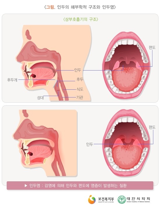 인두염(Pharyngitis)은 감염에 의해 인두와 편도에 염증이 발생하는 질환들을 말합니다. 따라서 인두염은 급성 편도염(Acute tonsillitis)과 급성 인후편도염(Acute Pharyngotonsillitis)을 포함하는 용어입니다. 물론 '인후통(Sore throat)'이라는 용어가 종종 인두염과 동일시되어 사용되기는 하지만 종종 다른 원인으로 발생하기도 합니다.