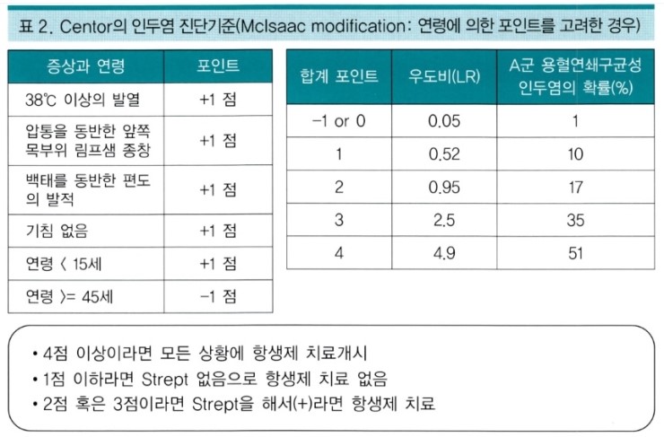 Centor의 진단기준에 따르면 항생제를 써야 하는 경우는 점수가 4점 이상일 때뿐입니다. 그 이하의 점수라면 항생제를 적극적으로 고려하지 않습니다. 다만 위와 같은 기준에 따라 진료를 하게 되더라도 과잉진료의 우려는 여전히 있습니다.