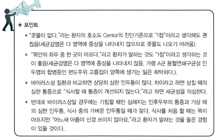 다음은 일차진료에서 인두염의 감별을 위해 가장 많이 사용되는 Centor의 진단기준입니다.