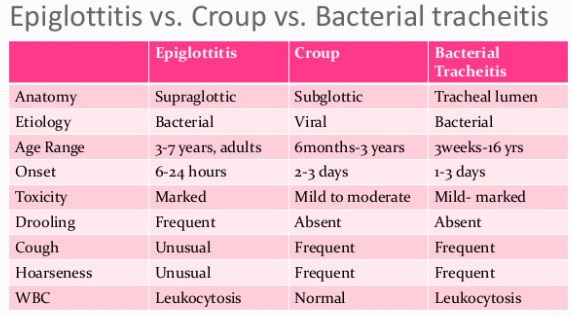| 1. 원인에 따른 분류 1) 감염성 크룹(Infectious croup) 감염성 크룹의 발생빈도는 계절별로는 겨울에 더 많이 발생되며, 성별로 볼 때는, 남아에서 더 자주 발생합니다. 환아의 약 15%에서는 가족력이 있으며 재발의 경향이 있습니다. 크룹이 잘 생기는 나이는 3개월에서 5세 사이이며, haemophilus influenzae에 의한 세균성 크룹은 2~7세에 흔한 것으로 알려져 있습니다. (1) 바이러스성 크룹(Viral croup) 감염성 크룹은 바이러스가 주된 원인으로 파라인플루엔자(parainfluenza) 바이러스가 75%로 가장 흔한 원인균으로 알려져 있습니다. 아데노바이러스나 respiratory syncytial virus, 인플루엔자 바이러스, 홍역 등의 바이러스도 원인이 되는 것으로 알려져 있는데 그 외 A형 인플루엔자는 특히 심한 후두기관기관지염과 연관 되는 것으로 알려져 있습니다. 드물게는 디프테리아가 원인이 되기도 합니다. (2) 세균성 크룹(Bacterial croup) 세균성 크룹은 매우 드물지만 세균중에서는 haemophilus influenzae나 streptococcus pyogenes, staphylococcus aureus, streptococcus pneumoniae, moxarella catarrhalis가 흔한 원인균으로 알려져 있습니다. 2) 비감염성 크룹(Noninfectious croup) (1) 위식도역류질환(GERD) (2) 알레르기성 크룹(Spasmodic croup) (3) 성대의 과다한 사용(Overuse of vocal cords) (4) 흡입성 스테로이드의 지속적인 사용(Prolonged use of inhaled corticosteroids) (5) 화상(Thermal or chemical burns) (6) 후두 외상(의인성 / 기도삽관) 2. 부위에 따른 분류 1) 성대와 성대 하부에 생긴 염증 (1) 후두염(Laryngitis) 또는 후두기관염(Laryngotracheitis) (2) 급성 감염 후두염(Acute infectious laryngitis) (3) 급성 연축 후두염(Spasmodic croup) (4) 후두 기관 기관지염(Laryngotracheobronchitis) (5) 후두 기관 기관지 페렴(Laryngotracehobronchopneumonitis) 2) 성대의 상부에 생긴 염증 : 후두개염(Epiglotitis) |