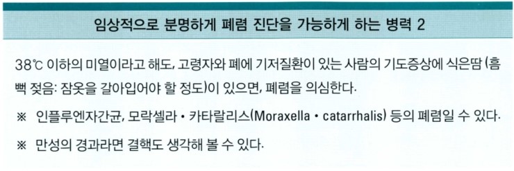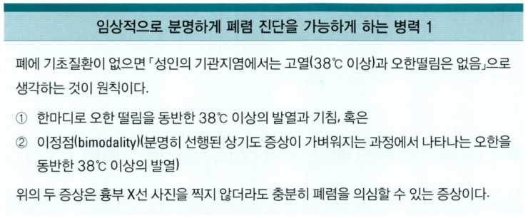 임상적으로 기관지염과 폐렴을 감별하는 힌트가 되는 병력은 아래와 같습니다.