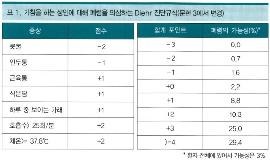아래는 임상적으로 폐렴을 의심할 수 있는 Diehr의 진단규칙입니다.