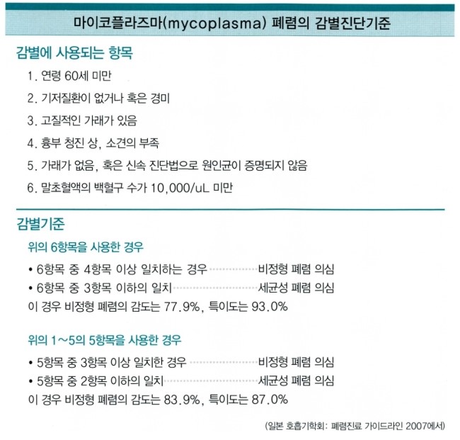 마이코플라스마 폐렴의 감별진단기준은 아래와 같습니다.