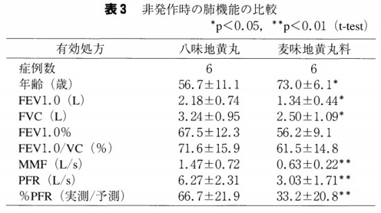 만성 천명 환자에게 팔미지황환 유효 16례와 맥미지황환료 유효 13례를 특징, 증상으로 비교했습니다. 냉증, 열감에 관한 증상에 차이는 없었으나 맥미지황환료군에서는 구건, 피부건조 경향이 더 현저했습니다. 맥미지황환료군에서는 팔미지황환군과 비교하여 비발작 시 1초량, peak-flow rate 등에 유의차가 나타났습니다. 이 연구는 만성 천식에서의 체액 부족이 연령 증가와 폐색성 폐기능 장애와 관련이 있다는 것도 시사했습니다.