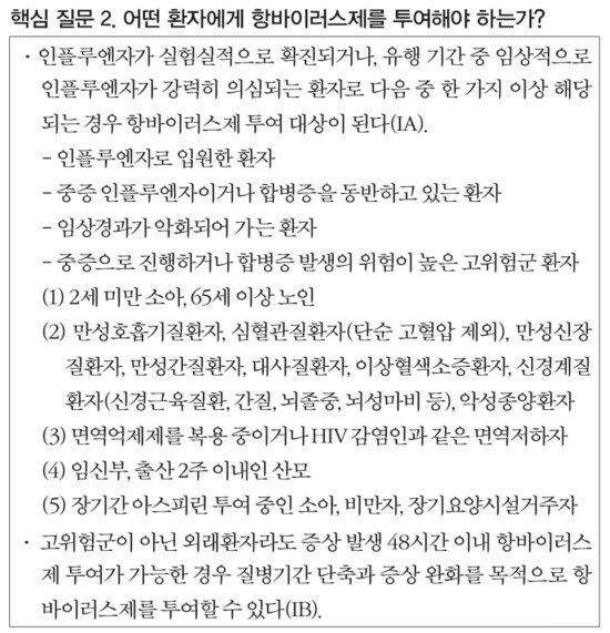고위험군이 아니고 외래로 내원하였으며 합병증을 동반하지 않은 인플루엔자 환자의 경우 항바이러스제(타미플루)를 투여하지 않더라도 대개 임상증상이 호전되는 경과를 보입니다. 외국의 인플루엔자 항바이러스제 투여지침에는 입원환자나 중증환자 또는 고위험군 환자에 항바이러스제를 투여할 것을 공통적으로 권고하고 있습니다.
