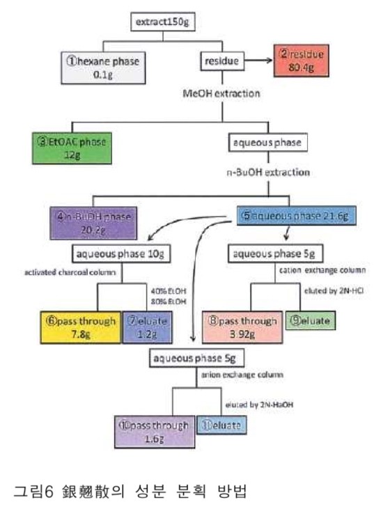 은교산을 유기용매로 분획하여 그 분획된 성분에 의해 바이러스 증식 억제 효과를 평가했더니 초산 에테르 분획 성분에 높은 활성이 나타났습니다. 아울러 은교산의 활성이 높은 부분을 HPLC 시스템으로 해석한 결과, 높은 바이러스 효과를 갖는 물질을 함유한 정점을 확인했습니다. 은교산에는 확실히 바이러스 증식을 억제하는 효과를 갖는 물질이 함유되어 있음을 시사했습니다.