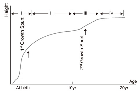 엄마 뱃속에서부터 출생 후 만 2세까지의 기간을 제1성장 급증기(growth spurt)라고 합니다. 이후 사춘기 전까지는 성장의 완만기입니다. 사춘기는 제2발육 급증기(adolescent growth spurt) 로서 2차 성징을 나타내면서 성인의 몸이 되는 마지막 시기입니다. 사춘기가 지나고나면 서서히 성장 속도가 둔화되어 만 20세가 넘으면 일반적으로 성장은 멈추게 됩니다.